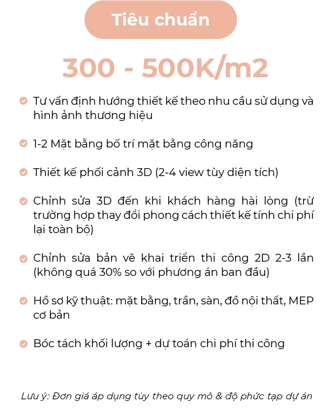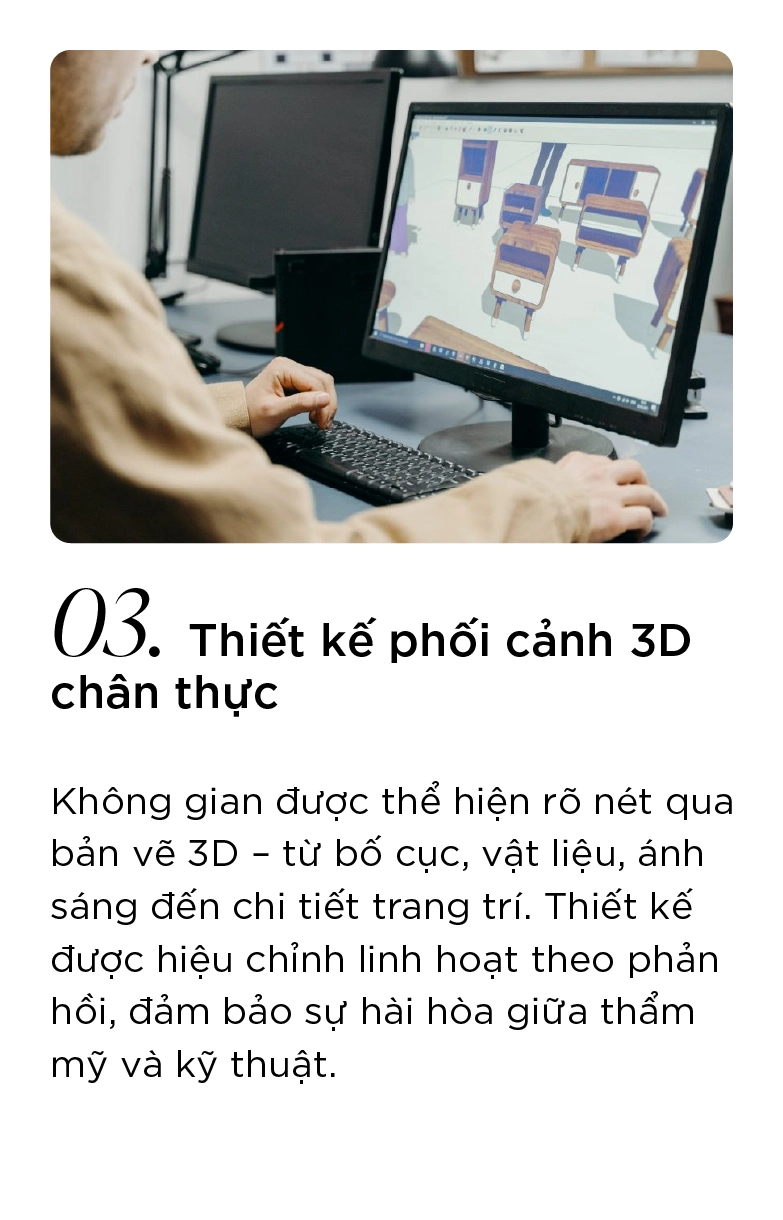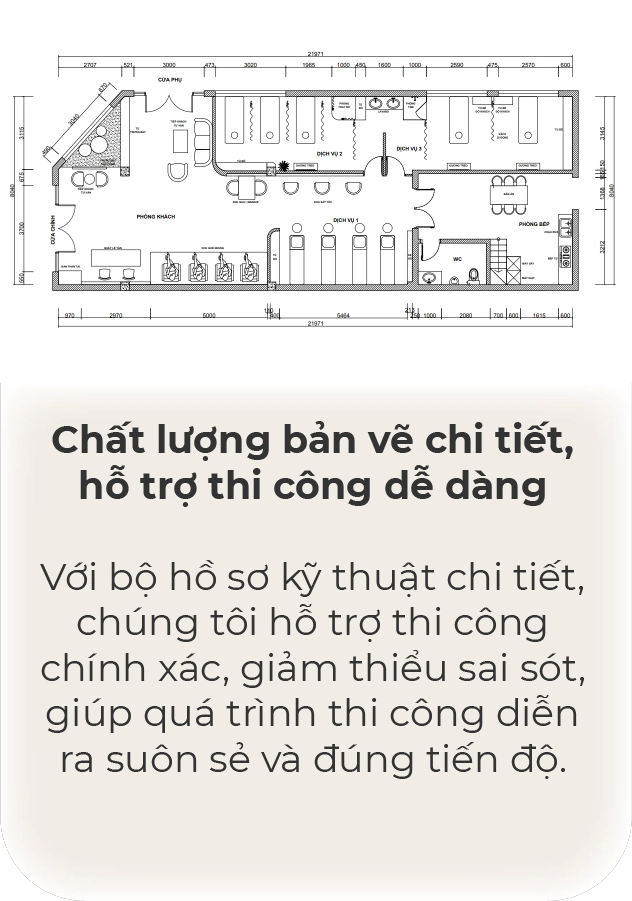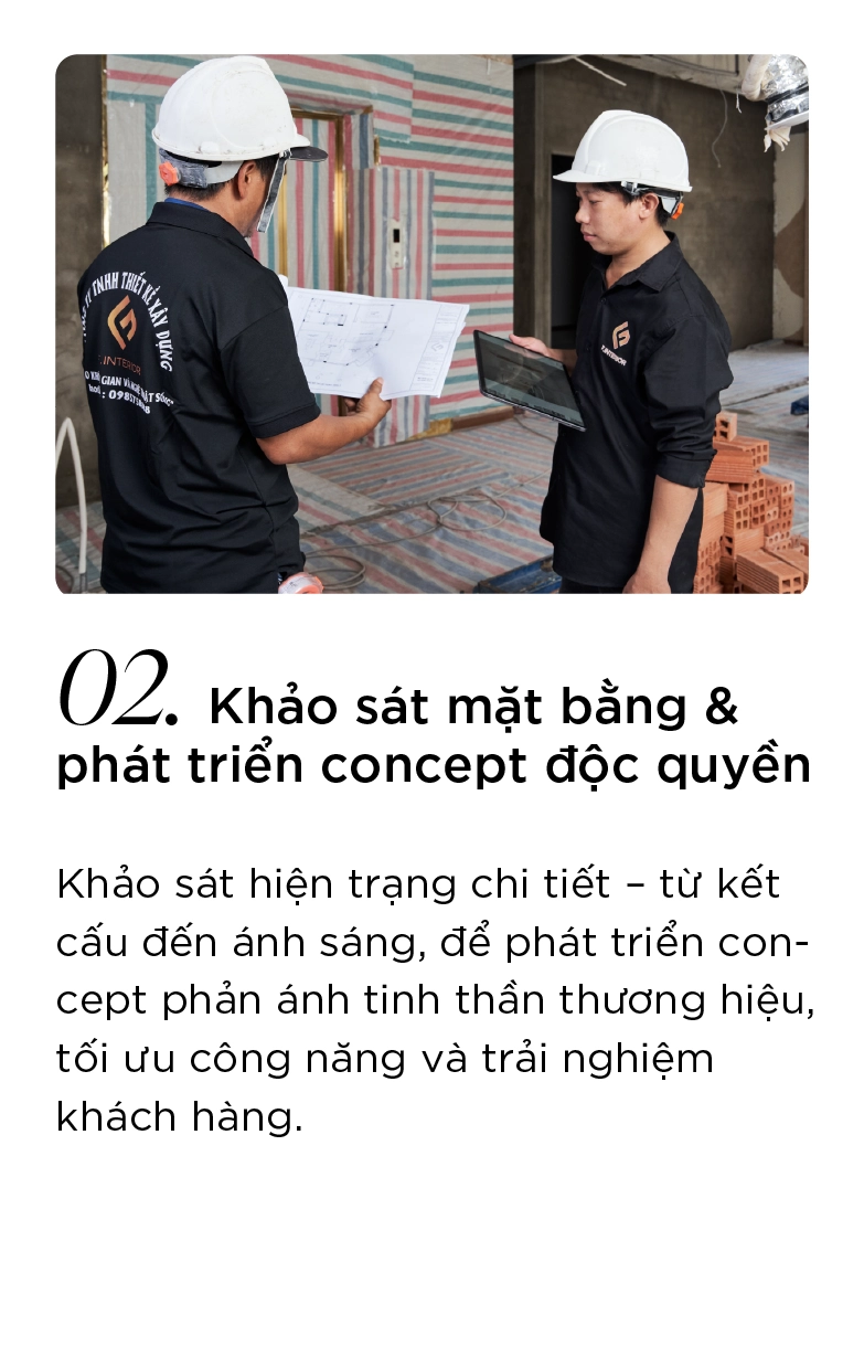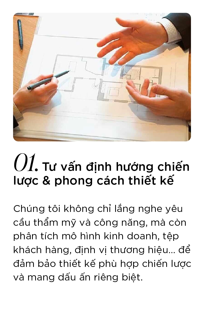 Chúng tôi không chỉ lắng nghe yêu cầu thẩm mỹ và công năng, mà còn phân tích mô hình kinh doanh, tệp khách hàng, định vị thương hiệu… để đảm bảo thiết kế phù hợp chiến lược và mang dấu ấn riêng biệt.