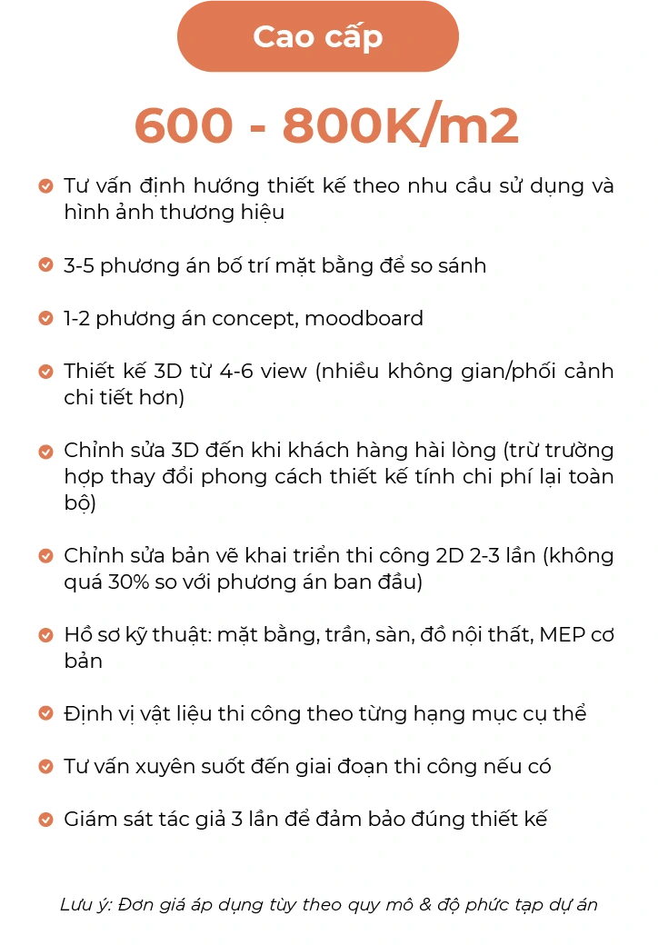 Chúng tôi mang đến giải pháp thiết kế toàn diện – từ ý tưởng đến hiện thực, đảm bảo tính đồng bộ, thẩm mỹ và hiệu quả thi công một cách chuyên nghiệp, cao cấp. Dịch vụ bao gồm: