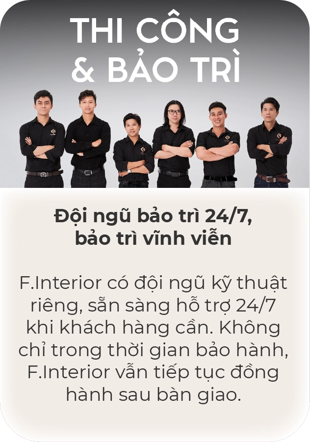 F.Interior có đội ngũ kỹ thuật riêng, sẵn sàng hỗ trợ 24/7 khi khách hàng cần. Không chỉ trong thời gian bảo hành, F.Interior vẫn tiếp tục đồng hành sau bàn giao.