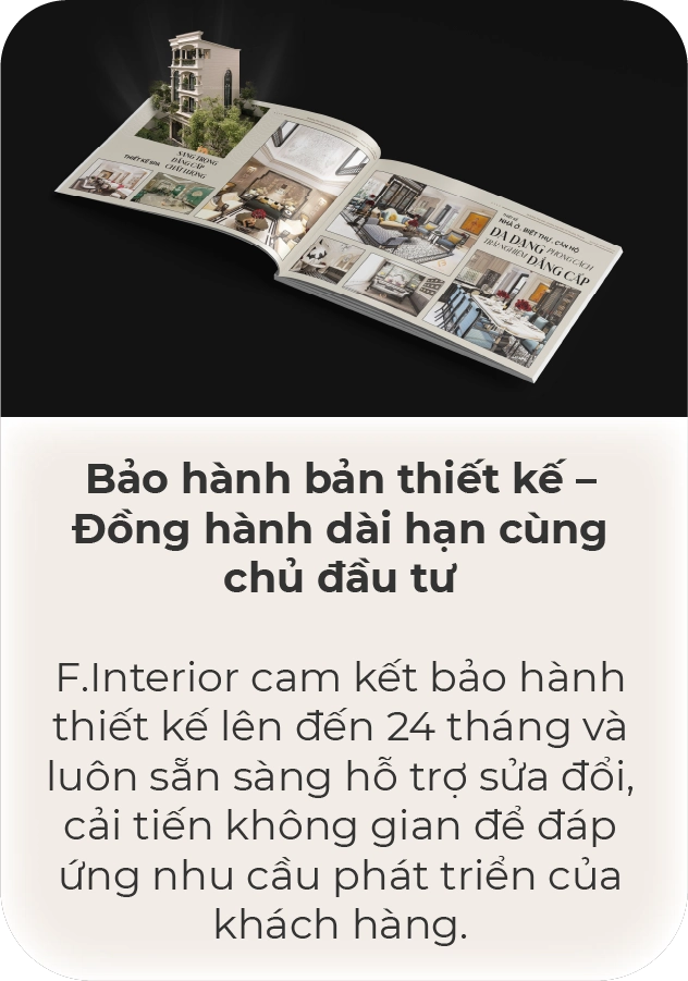 F.Interior cam kết bảo hành thiết kế lên đến 24 tháng và luôn sẵn sàng hỗ trợ sửa đổi, cải tiến không gian để đáp ứng nhu cầu phát triển của khách hàng.