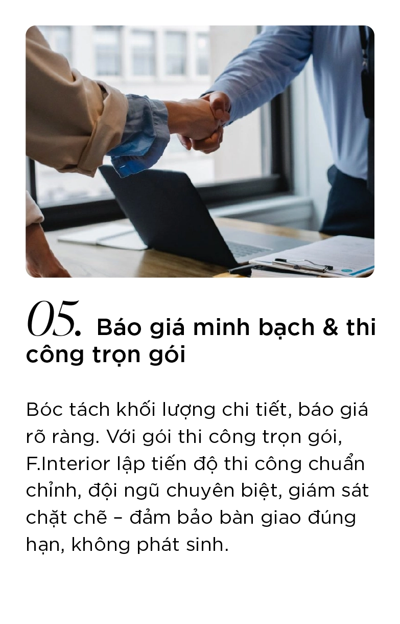 Bóc tách khối lượng chi tiết, báo giá rõ ràng. Với gói thi công trọn gói, F.Interior lập tiến độ thi công chuẩn chỉnh, đội ngũ chuyên biệt, giám sát chặt chẽ – đảm bảo bàn giao đúng hạn, không phát sinh.