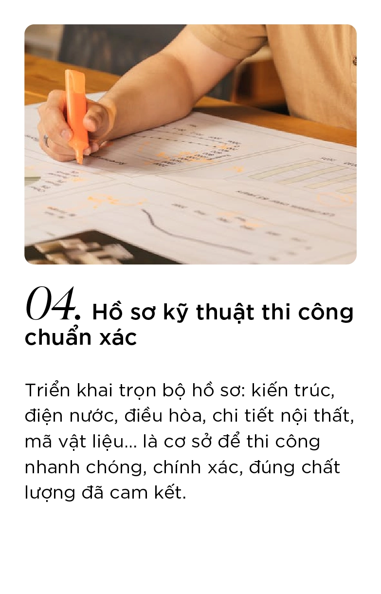 Triển khai trọn bộ hồ sơ: kiến trúc, điện nước, điều hòa, chi tiết nội thất, mã vật liệu… là cơ sở để thi công nhanh chóng, chính xác, đúng chất lượng đã cam kết.